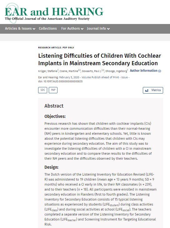 Drs Krijger van de UGent publiceert samen met de oorgroep over de sociale en schoolse moeilijkheden die adolescenten met CI ervaren.